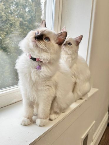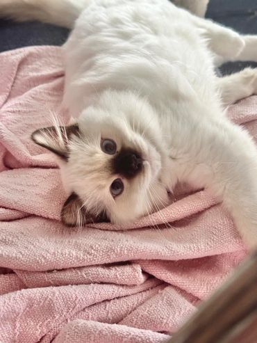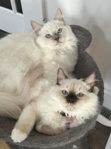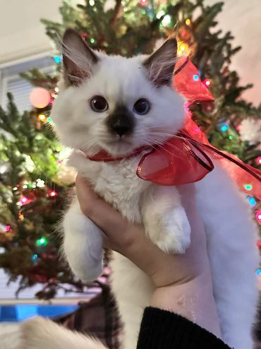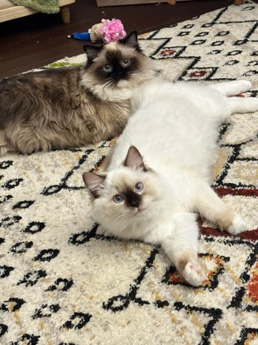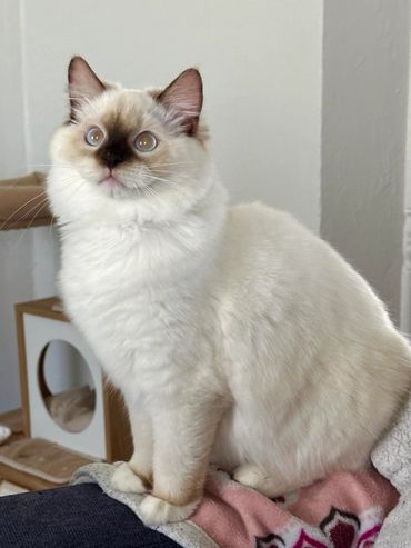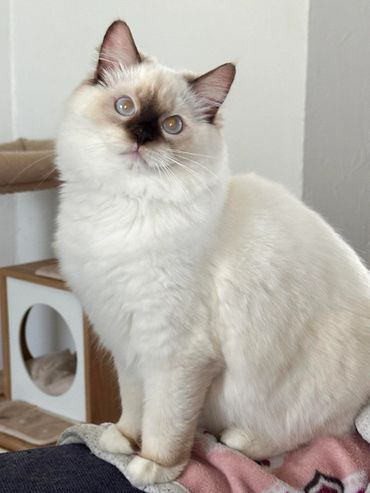 Cocoa is actually still fairly young - Ragdolls take 3 - 4 years to reach their 'full color', so her face markings will continue to fill in with rich dark brown color. If you compare Cocoa's pictures to her mother - Willow's pictures, you can see the clear difference in a chocolate point vs a seal point! (Willow is a seal point who carries the chocolate gene needed to make Cocoa's color.)