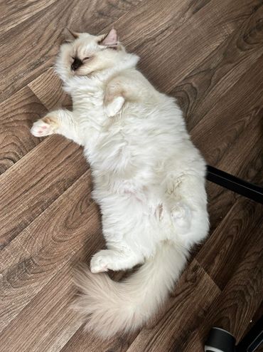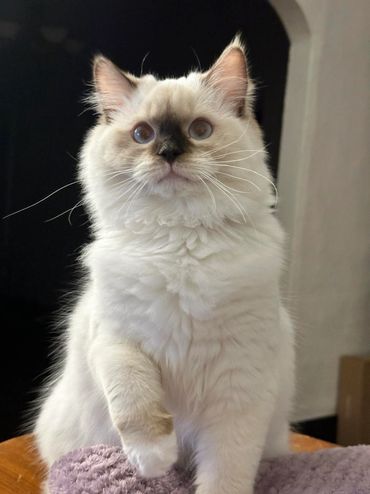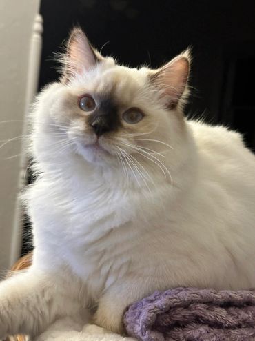 Besides color, I love Cocoa's build and structure. She has beautiful ears with rounded tips as the standard calls for, oval shaped blue eyes, and an excellent muzzle and chin that are moderate, balanced, and well defined. She has an excellent coat for a Ragdoll, it is bunny soft, single layered, long without being wooly, and never mats.