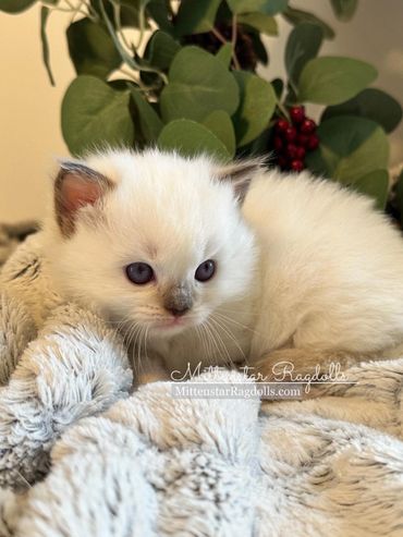Cocoa Chanel is a stunning and very rare, chocolate point Ragdoll! The chocolate gene is very hard to find and preserve in the breed! It actually changes the coat color to a rich brown, and when combined with the 'colorpoint' gene that all Ragdolls have - it gives them beautiful, milk chocolate colored 'points' on their ears, face, tail and legs - with a light cream, nearly white body.