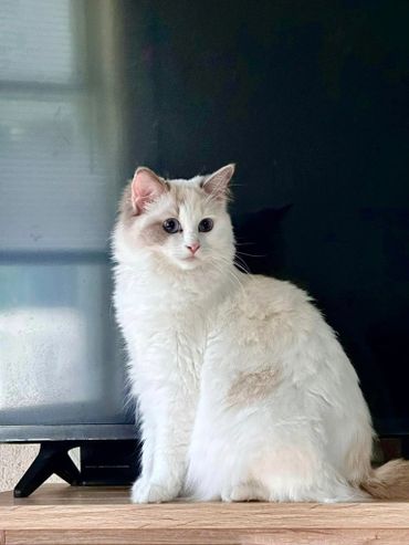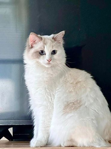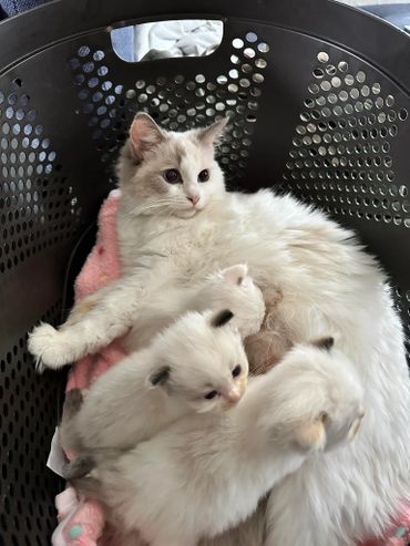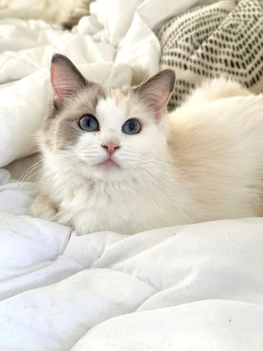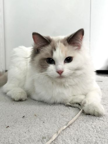Elsie is a stunning BLUE CREAM TORTIE BICOLOR - so that means she carries the 'red' gene - which makes her a CALICO POINTED cat! So her points are 'blue' and 'cream' mixed together - she is stunning, and has the sweetest personality. She especially loves cuddling in bed making 'biscuits' while she snuggles!